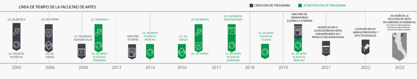 Actualmente, la facultad cuenta con cuatro programas de licenciatura: Artes plásticas, Danza, Artes cinematográficas y producción audiovisual, y Animación digital y efectos visuales. Además, se atiende a las unidades académicas del Campus Mexicali con el programa de Actividades culturales con valor en créditos.